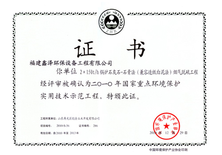 2010年国家重点环境保护实用技术示范工程证书(石灰石-石膏法兼容造纸白泥法烟气脱硫工程)