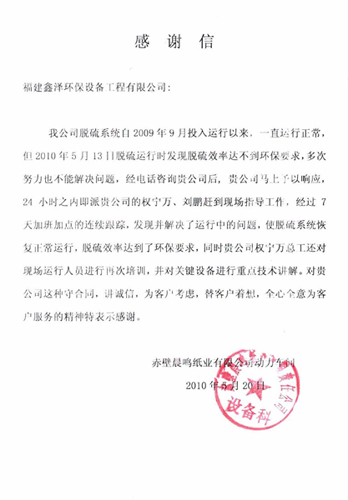 5月14日,我公司本着“想客户之所想,急客户之所急”的服务理念,即时安排副总工程师、项目经理赶赴赤壁晨鸣纸业有限公司烟气脱硫项目现场进行技术指导。针对13日客户提出的问题,他们加班加点,积极排查,并克服困难,完善处理了浆液平衡(已出石膏);纠正了滤布跑偏;通过更换塔体排放阀、石膏泵叶轮、机封及控制阀等解决问题,21日圆满完成了该脱硫系统整改等技术指导工作。目前系统正常运行,二氧化硫达标排放。 他们的辛苦和努力得到客户的赞赏,我公司于20日收到客户发来的感谢信,对我公司讲诚信,全心全意为客户服务的精神表示感谢。 公司要求工程人员继续发扬“全心全意为客户服务”、“想客户之所想,急客户之所急”的服务理念,“迅速反应,马上行动”的工作作风;并持续改进,不断提升我们的服务品质,建立广泛、良好的客户信誉。
