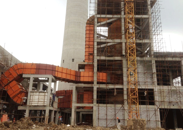 由我公司总承包的吉林晨鸣纸业有限责任公司工业废料再利用焚烧发电工程3×130t/h锅炉烟气脱硫系统,在业主和监理单位的大力支持和配合下,经过项目部和施工单位两个多月的努力,现1#脱硫塔已封顶,正在完善管口和平台斜梯,2#脱硫塔也将于七月底前完成封顶,1#、2#出口烟道均已吊装完成,正在进行烟道连接工作。